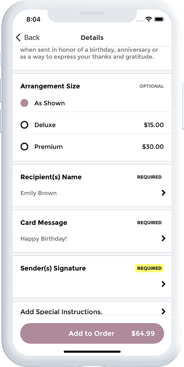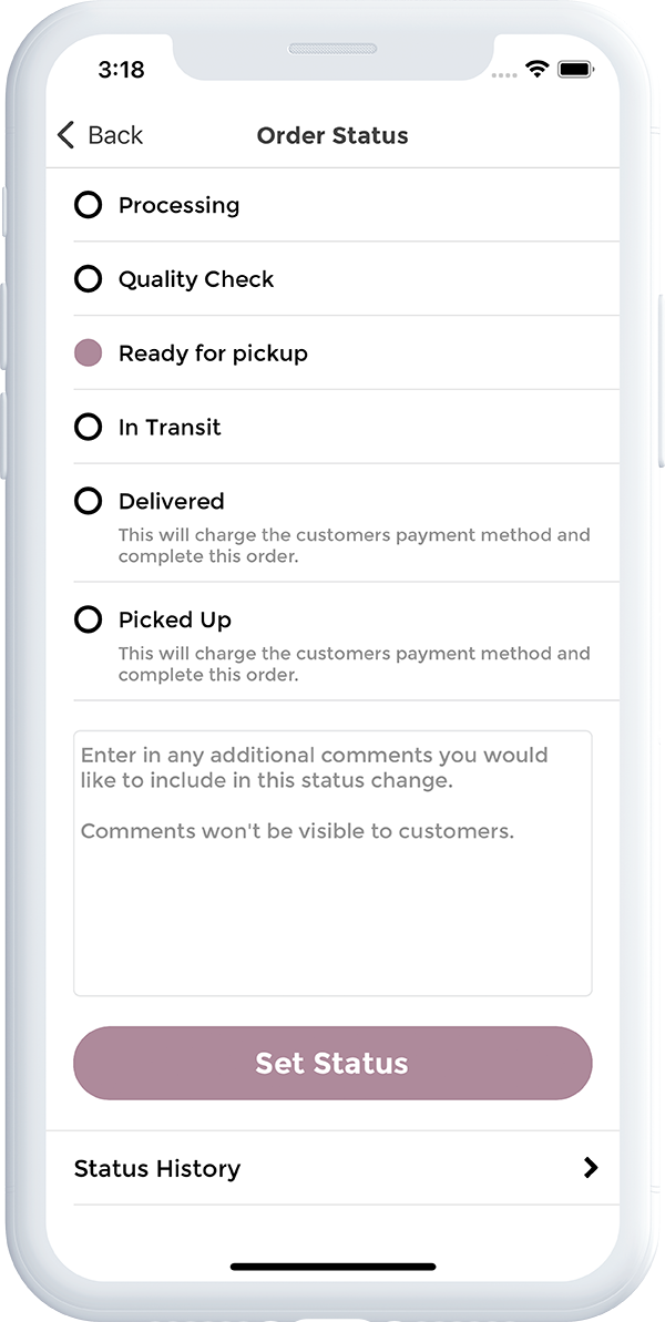 Our robust and completely customizable order status feature can be accessed right from the App.